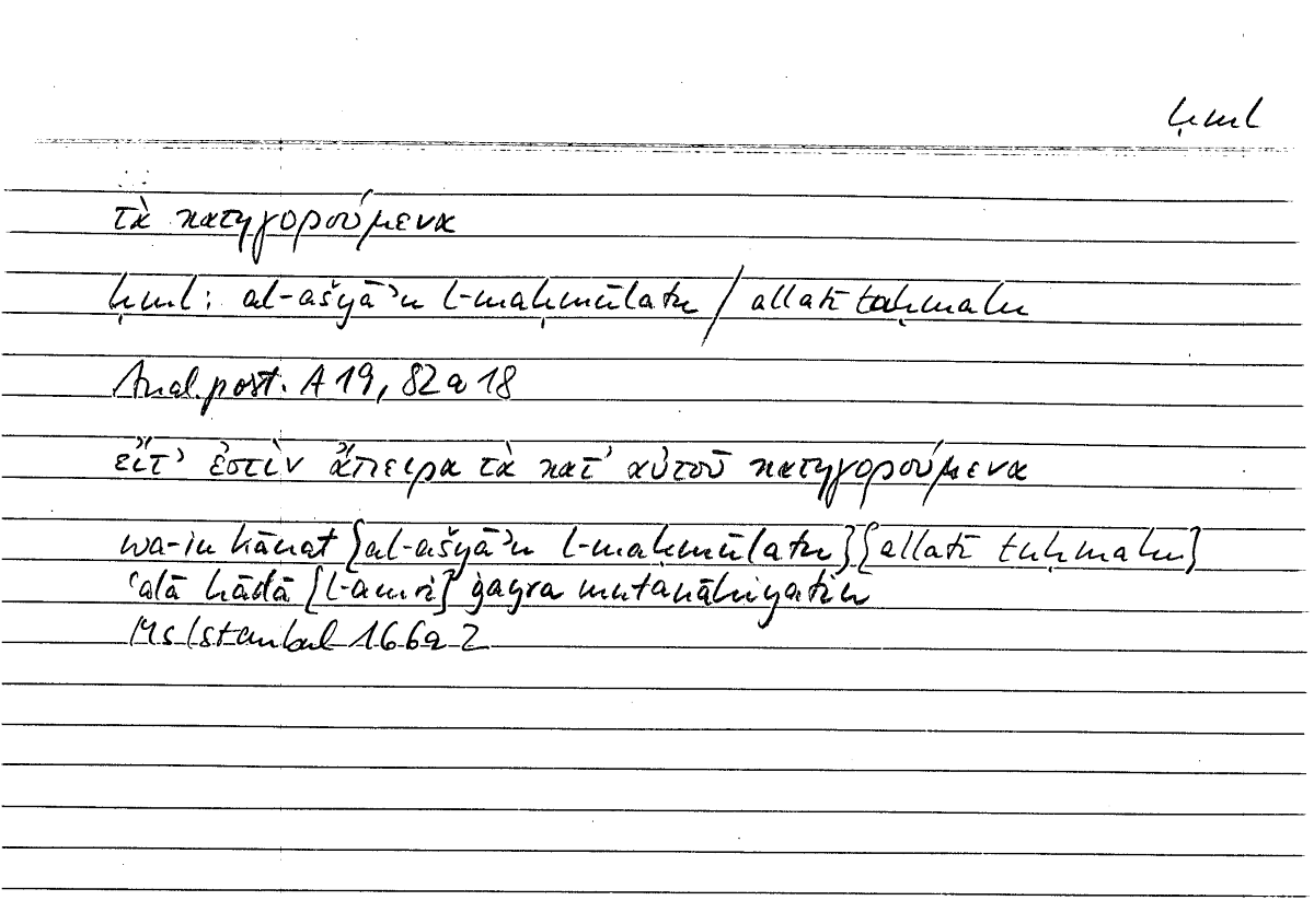 | Expression | τὰ κατηγορούμενα | al-ašyāʾu l-maḥmūlatu |