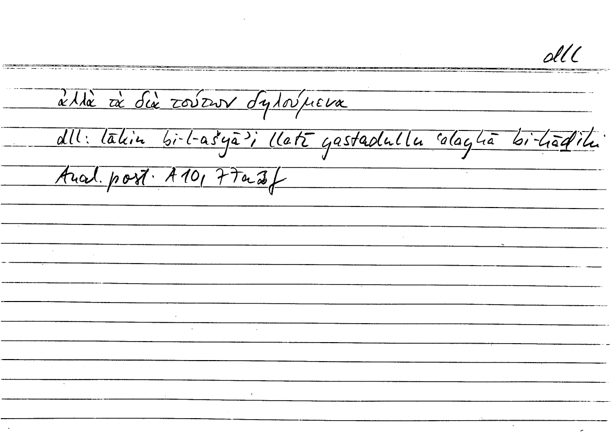 | Expression | ἀλλὰ τὰ διὰ τούτων δηλούμενα | lākin bi-l-ašyāi llatī yastadullu ʿalayhā bi-hāḏihi |