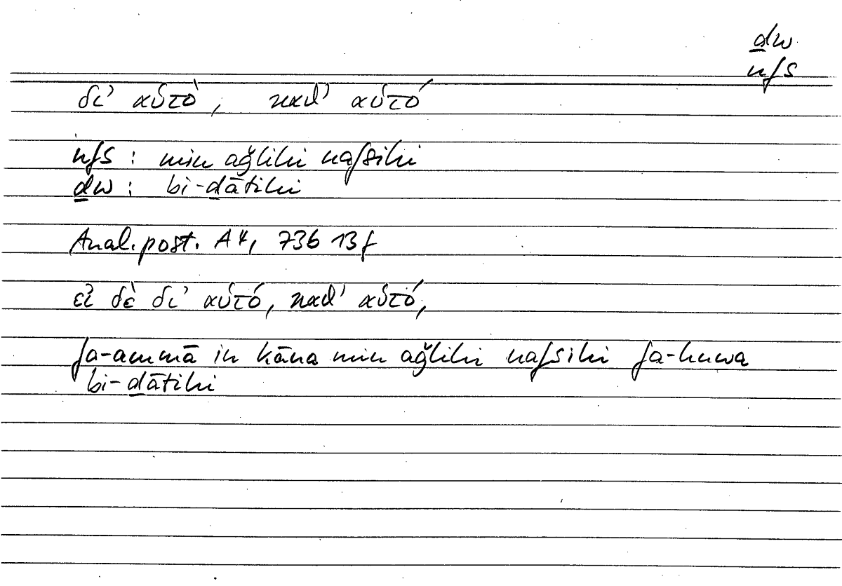 Expressionδι' αὑτὸ, καθ' αὑτόmin aǧlihi nafsihi...bi-ḏātihi