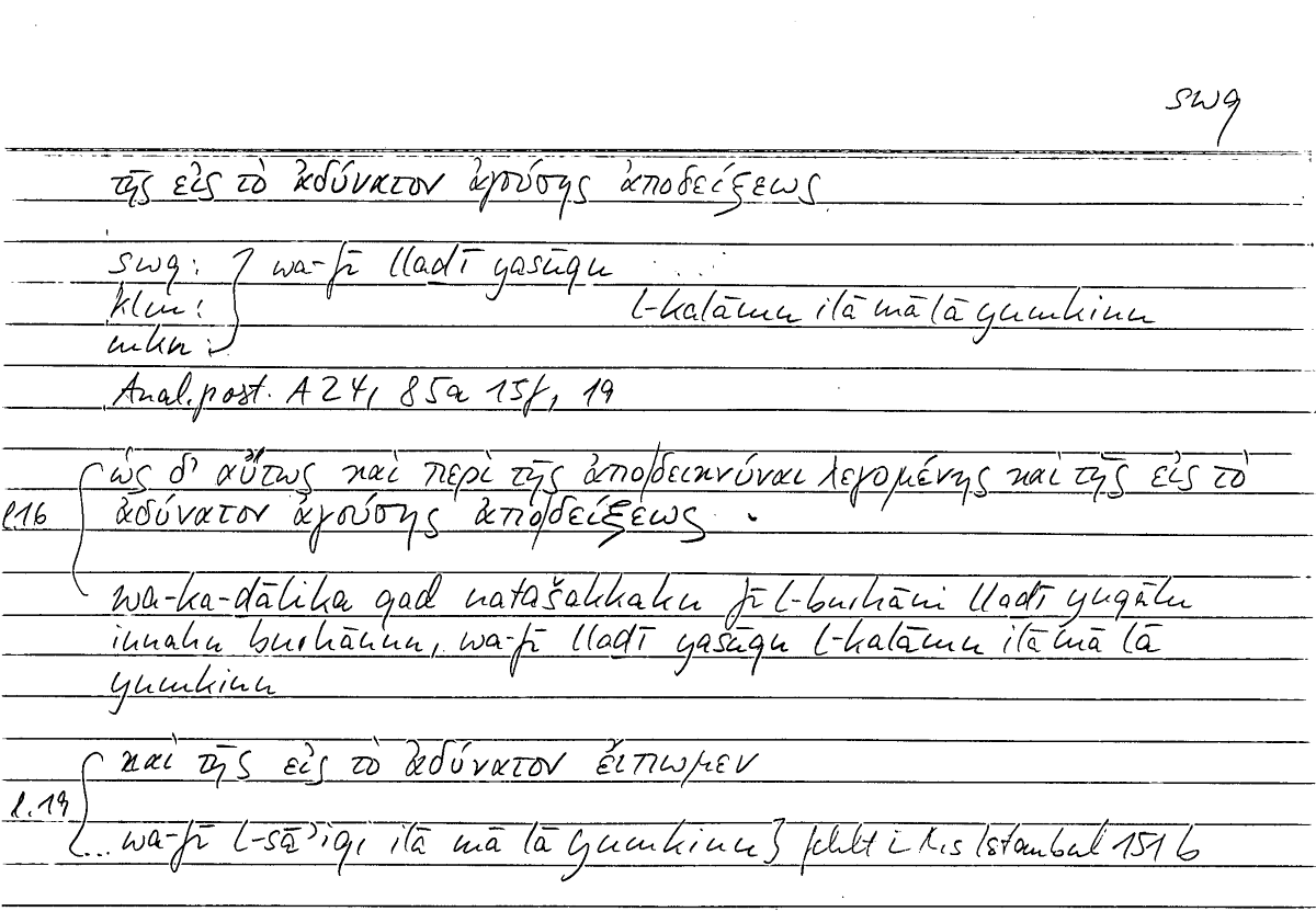 | Expression | τῆς εἰς ἀδύνατον ἀγούσις ἀποδείξεως | wa-fī llaḏī yasūqu l-kalāmu ilā mā yumkinu |