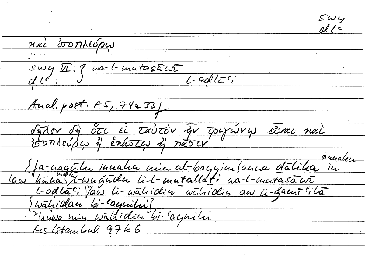 | Expression | καὶ ἰσοπλεύρῳ | wa-l-mutasāwī l-aḍlāʿi |