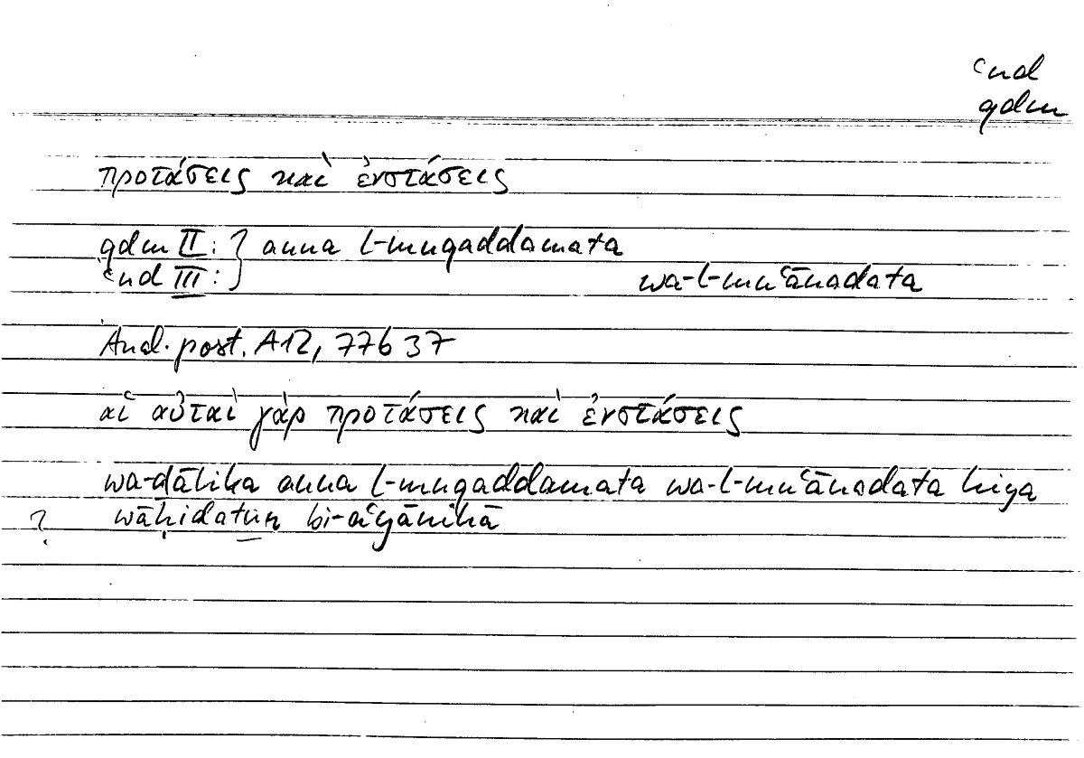 Expressionπροτάσεις καὶ ἐνστάσειςanna l-muqaddamata wa-l-muʿānadata