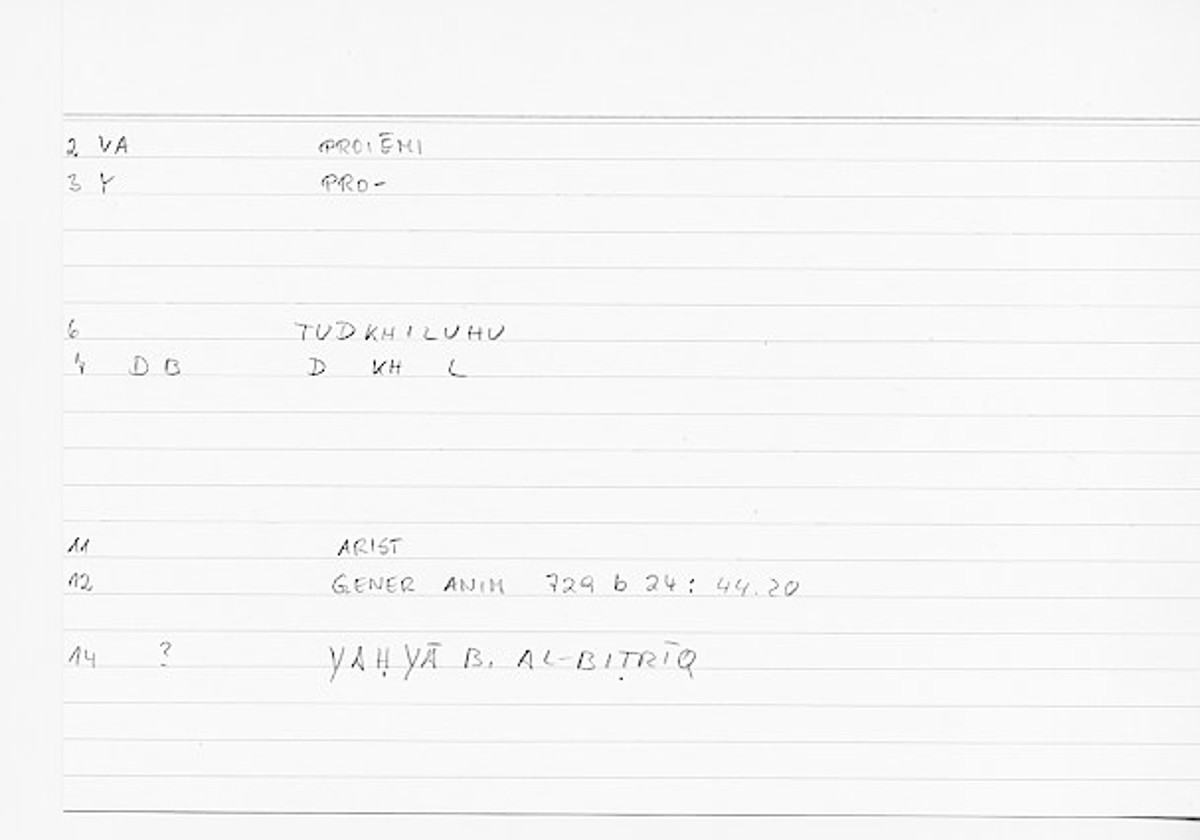 Every record of the glossary holds information on one translated word from Greek into Arabic. The records provide grammatical data and editor's comments as well. The transcription of the references is still in progress. If no reference is given here, you can check open the glossary by clicking on the lemma and consult the original filecard scan.