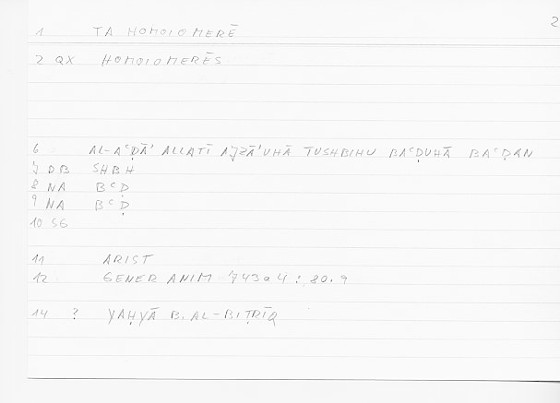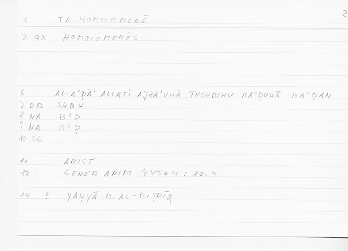 Every record of the glossary holds information on one translated word from Greek into Arabic. The records provide grammatical data and editor's comments as well. The transcription of the references is still in progress. If no reference is given here, you can check open the glossary by clicking on the lemma and consult the original filecard scan.