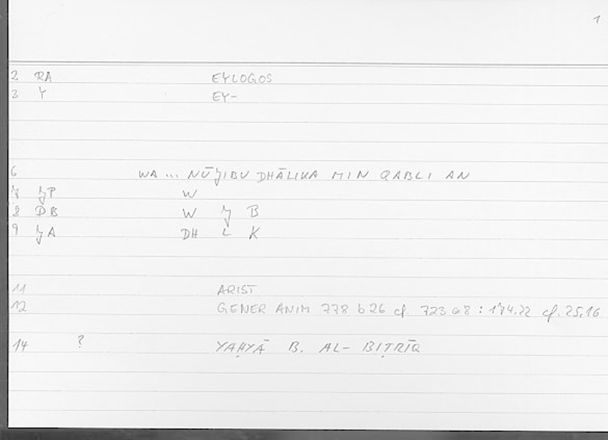 Every record of the glossary holds information on one translated word from Greek into Arabic. The records provide grammatical data and editor's comments as well. The transcription of the references is still in progress. If no reference is given here, you can check open the glossary by clicking on the lemma and consult the original filecard scan.