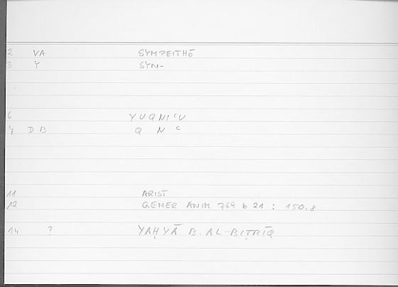 Every record of the glossary holds information on one translated word from Greek into Arabic. The records provide grammatical data and editor's comments as well. The transcription of the references is still in progress. If no reference is given here, you can check open the glossary by clicking on the lemma and consult the original filecard scan.