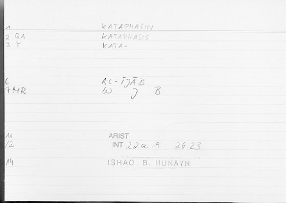 Every record of the glossary holds information on one translated word from Greek into Arabic. The records provide grammatical data and editor's comments as well. The transcription of the references is still in progress. If no reference is given here, you can check open the glossary by clicking on the lemma and consult the original filecard scan.