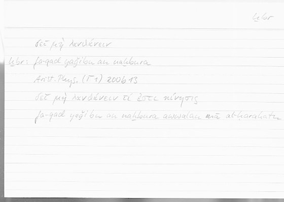 | Quotation | δεῖ μὴ λανθάνειν τί ἐστι κίνησις | fa-qad yaǧibu an nuḫbira awwalan mā l-ḥarakatu |