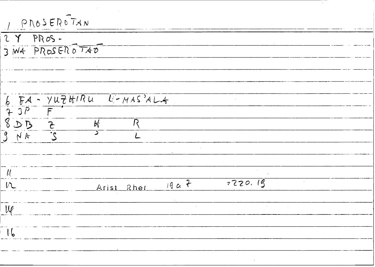 Every record of the glossary holds information on one translated word from Greek into Arabic. The records provide grammatical data and editor's comments as well. The transcription of the references is still in progress. If no reference is given here, you can check open the glossary by clicking on the lemma and consult the original filecard scan.