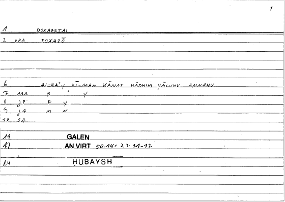| Quotation | οὐχ ὡς νοσῶν ἀλλ' ὡς ἑκὼν κακὸς <κακῶς> δοξάζεται | wa-llaḏī ʿalayhī l-raʾyu fī man kānati hāḏihi ḥāluhū annahū insānun sūʾun lā min qibali annahū marīḍu l-nafsi bal min qibali irādatihī |