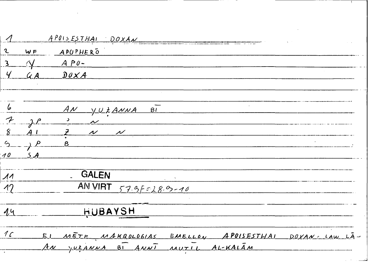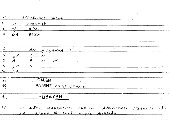 | Quotation | εἰ μή τε μακρολογίας ἔμελλον ἀποίσεσθαι δόξαν ἀναλίσκειν τε τὸν χρόνον μάτην | law lā annanī ufnī l-zamāna bāṭilan wa-an yuẓanna bī annī muṭīlu l-kalāmi |