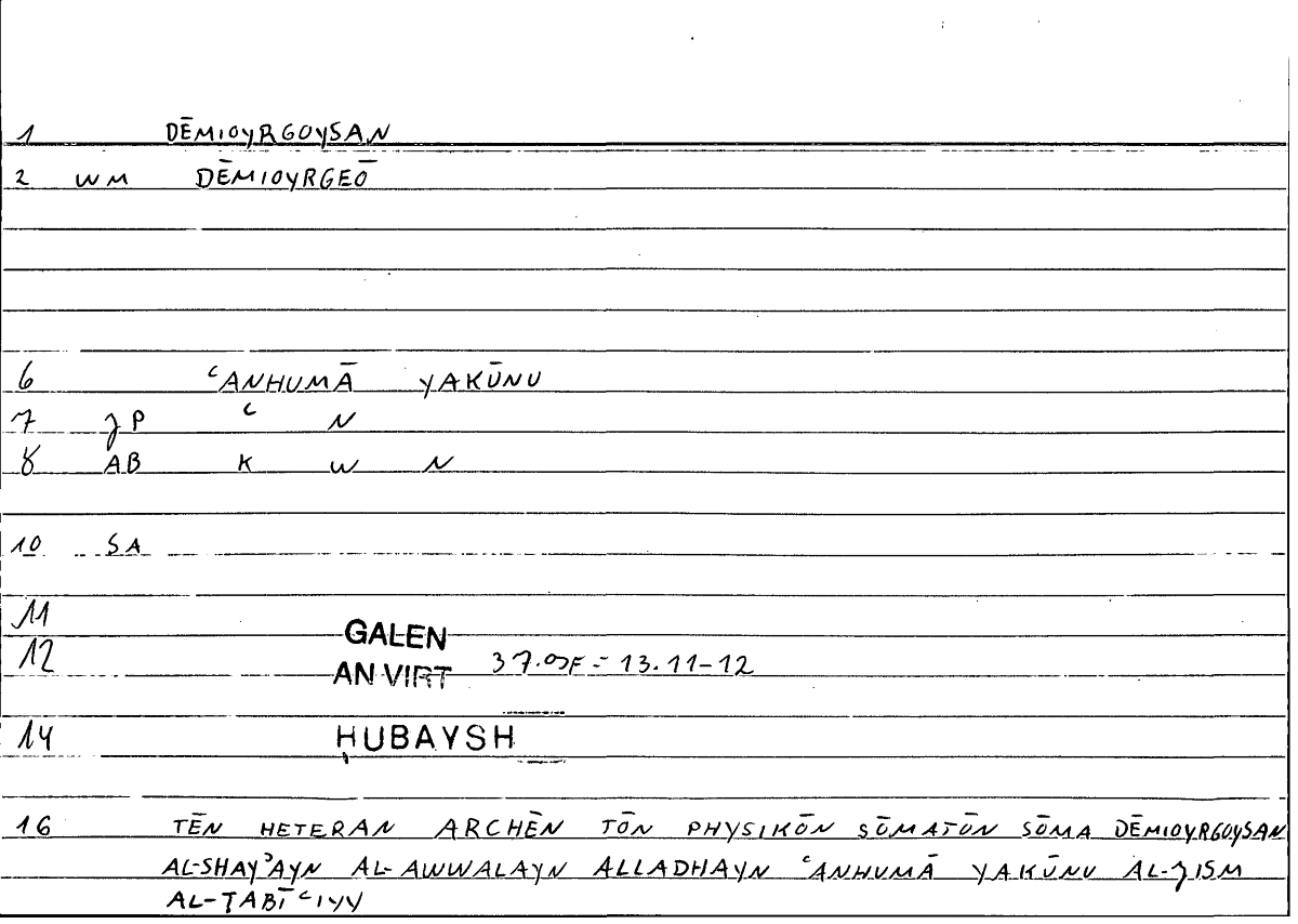 | Quotation | τὴν ἑτέραν ἀρχὴν τῶν φυσικῶν σωμάτων σῶμα δημιουργοῦσαν | al-šayʾayni l-awwalayni llaḏayni ʿanhumā yakūnu al-ǧismu l-ṭabīʿiyyu |