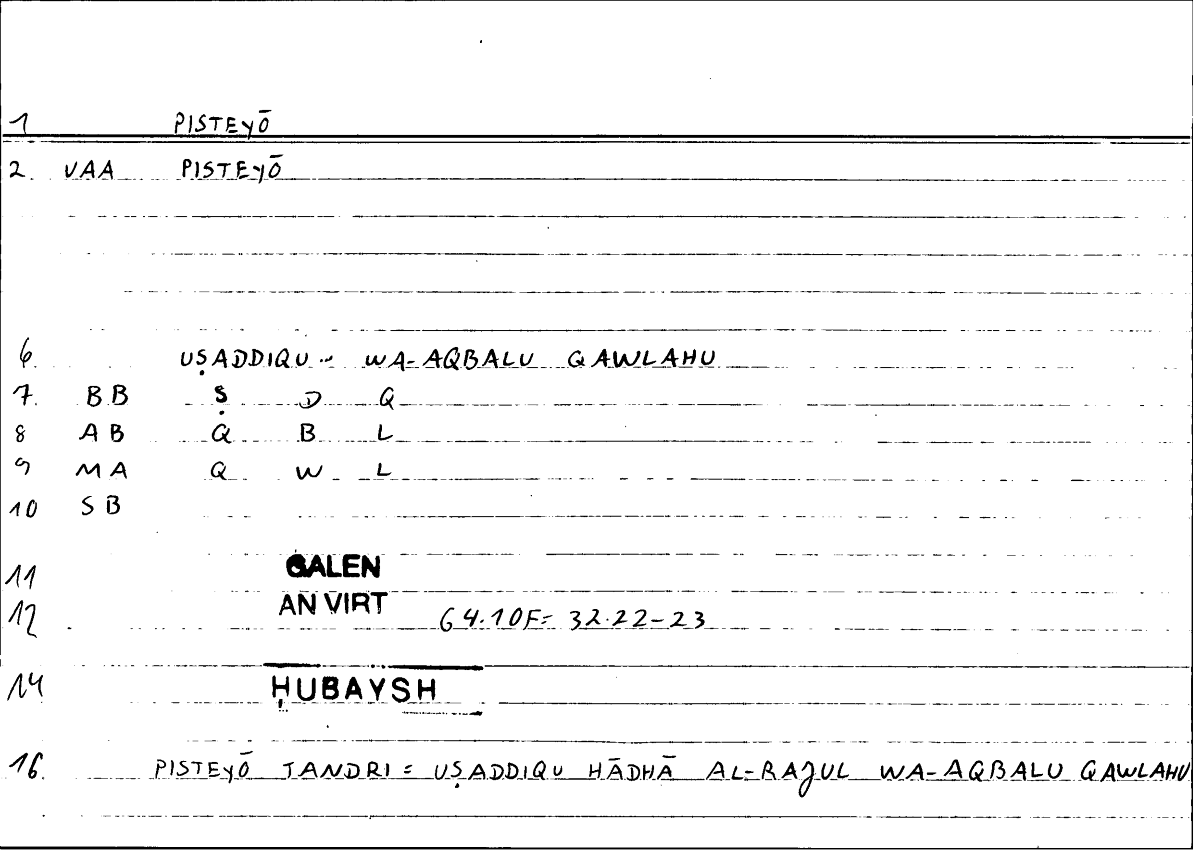 | Quotation | ἐγὼ δ᾿ οὐχ ὡς μάρτυρι πιστεύω τἀνδρί | anā laysa uṣaddiqu hāḏā l-raǧula wa-aqbalu qawlahū min aǧli šahādatihī ʿalā qawlī |