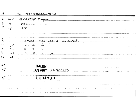 | Quotation | ὅτι μὲν οὖν ὁ Πλάτων αὐτὸς ὁμολογεῖ τὰ προαποδεδειγμένα ὑπ’ ἐμοῦ | anna Aflāṭūn kāna muwāfiqan li-mā taqaddama l-burhānu minnī ʿalayhi |