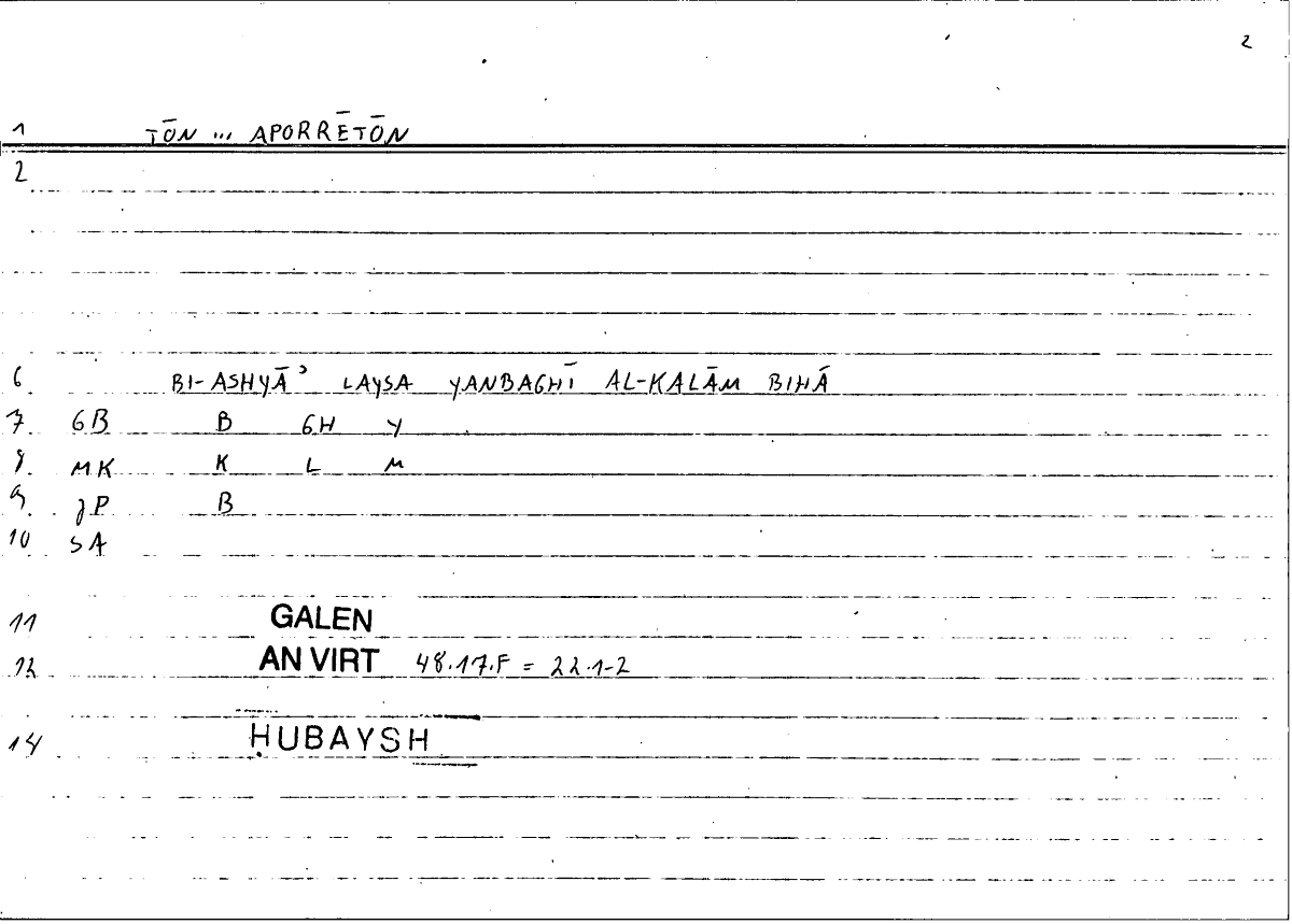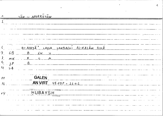 | Quotation | καὶ φθέγγηταί (sc. ἡ ψυχὴ) τι τῶν αἰσχρῶν ἢ ἀπορρήτων | wa-tatakallamu (sc. al-nafsu) bi-ašyāʾa samiǧatin aw bi-ašyāʾa laysa yanbaġī l-kalāmu bihā |
