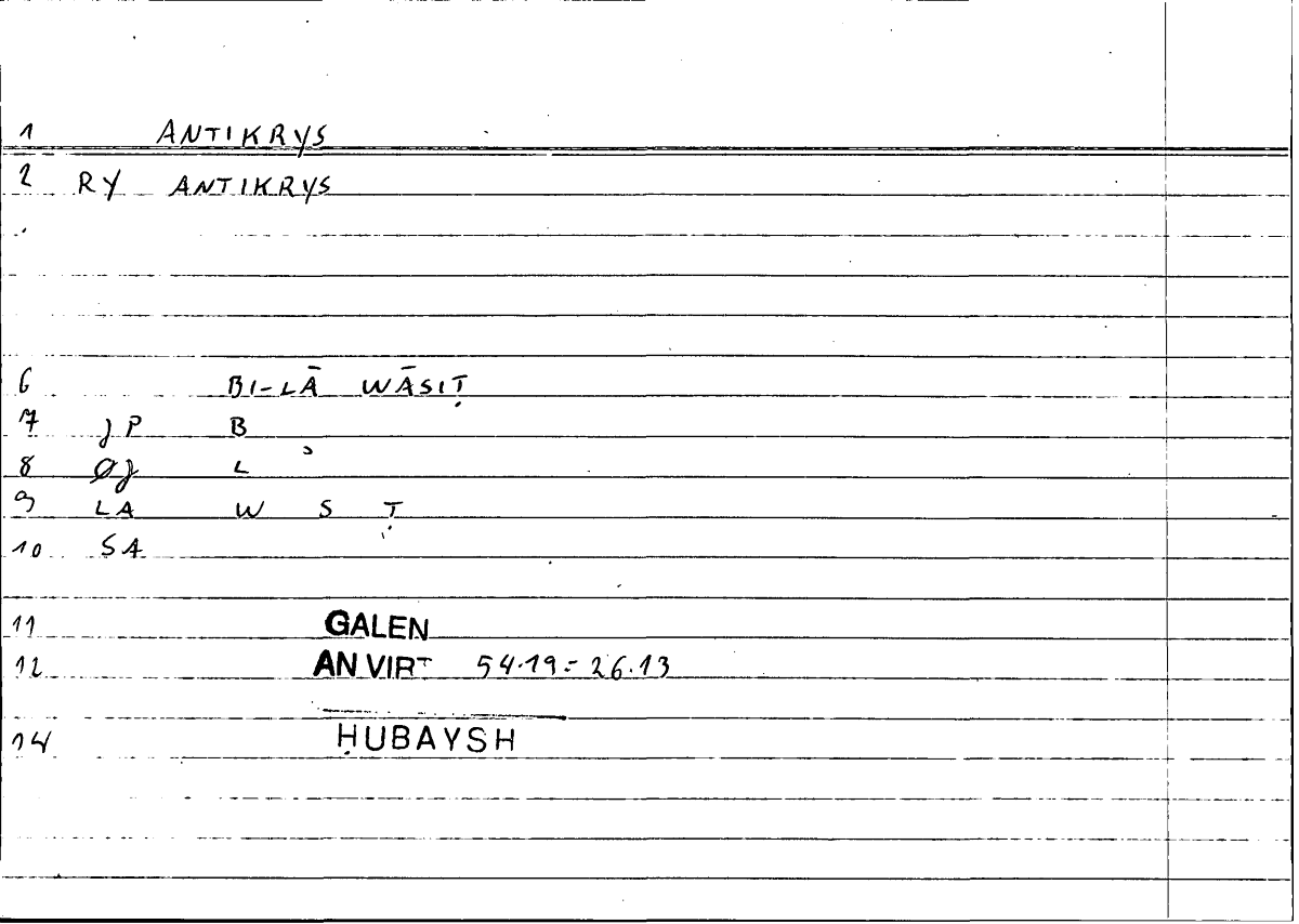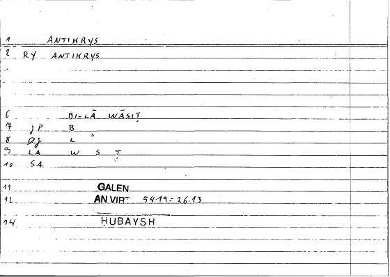 | Quotation | τὰ κατὰ τὸ πρῶτον εἰρημένα ..., ὧν τινὰ μὲν ἄντικρυς εἰς ... ἀνάγεται, τινὰ δὲ διὰ μέσων ... | fa-inna baʿḍa mā ḏakara (sc. Arisṭū) hunāka murtafiʿun ilā ... bi-lā wāsiṭin wa-baʿḍuhū bi-tawassuṭi ... |
