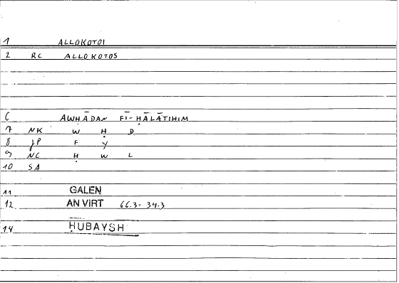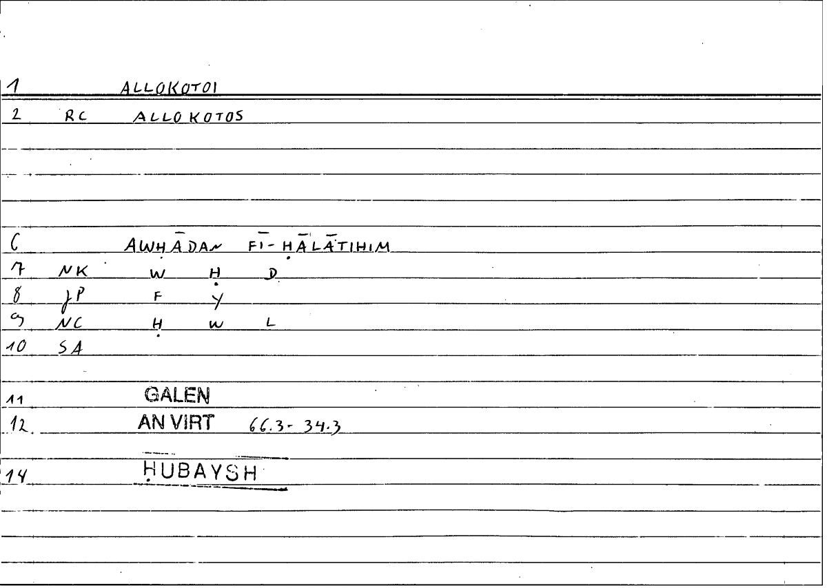 | Quotation | οἱ μέν γέ που διὰ πνεύματα παντοῖα ... ἀλλόκοτοί τ’ εἰσὶ καὶ ἀνείδεοι αὐτῶν, οἱ δὲ δι’ ὕδατα, οἱ δὲ δι’ αὐτὴν τὴν ἐκ τῆς γῆς τροφὴν | inna baʿḍa l-nāsi min qibali l-riyāḥi l-muḫtalifati ... yakūnūna awḥādan fī ḥālātihim ġurabāʾa wa-baʿḍu l-nāsi yakūna ka-ḏālika min qibali l-māʾi wa-baʿḍun ... mina l-ġiḏāʾi l-wāṣili ilā abdānihim mina l-arḍi |