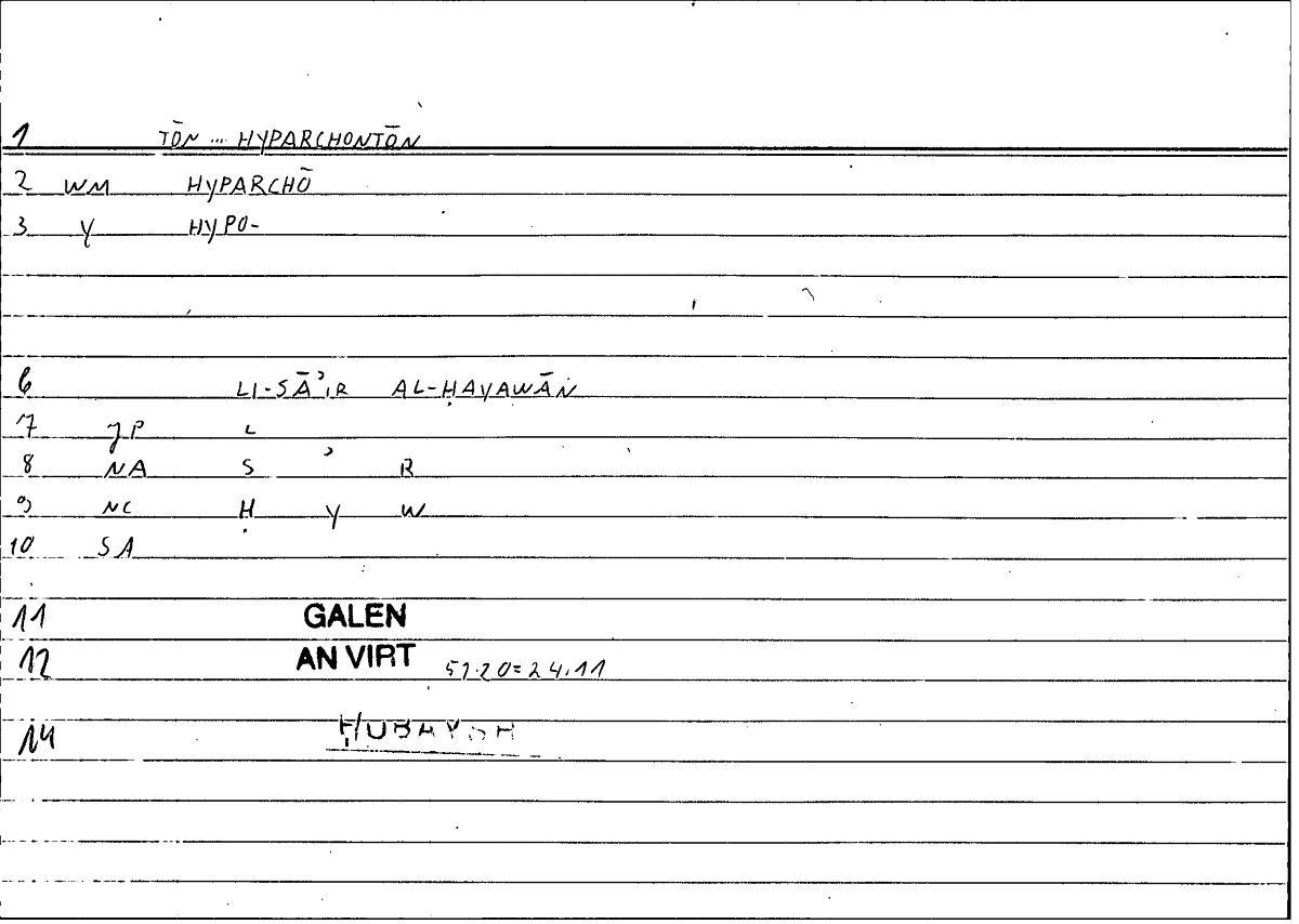 | Quotation | τὴν αὐτὴν δ' ἔχει διαφορὰν καὶ τῶν ἀνάλογον ὑπαρχόντων πρὸς τὸ αἷμα | wa-l-ḥālu fī-mā yaqūmu li-sāʾiri l-ḥayawāni maqāmu l-dami ka-l-ḥālu fī l-dami |