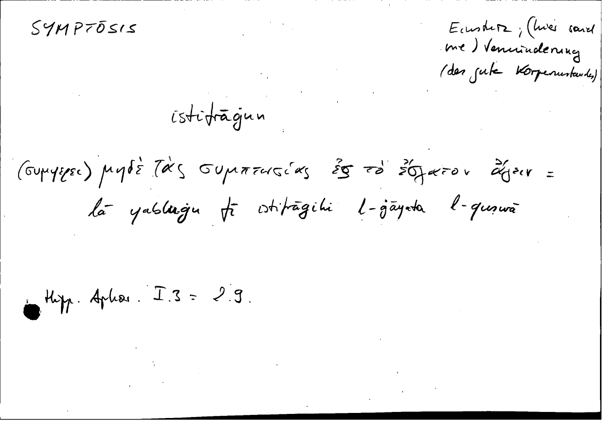 | Quotation | μηδὲ τὰς συμπτώσιας ἐς τὸ ἔσχατον ἄγειν | lā yabluġu fī stifrāġihī l-ġāyata l-quṣwā |