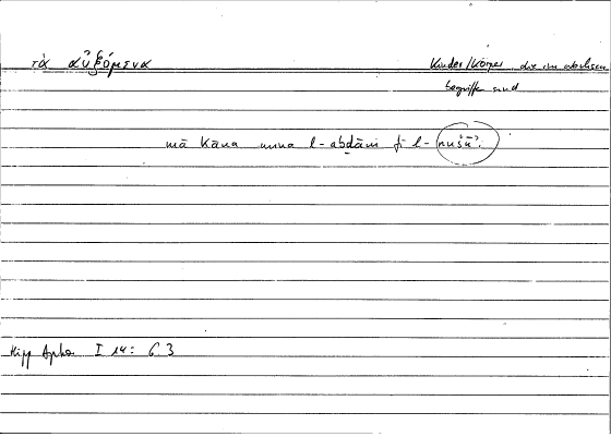 | Quotation | τὰ αὐξανόμενα πλεῖστον ἔχει τὸ ἔμφυτον θερμόν | mā kāna mina l-abdāni fī l-nušūʾi fa-l-ḥārru l-ġarīziyyu fīhi ʿalā ġāyati mā yakūnu mina l-kaṯrati |
