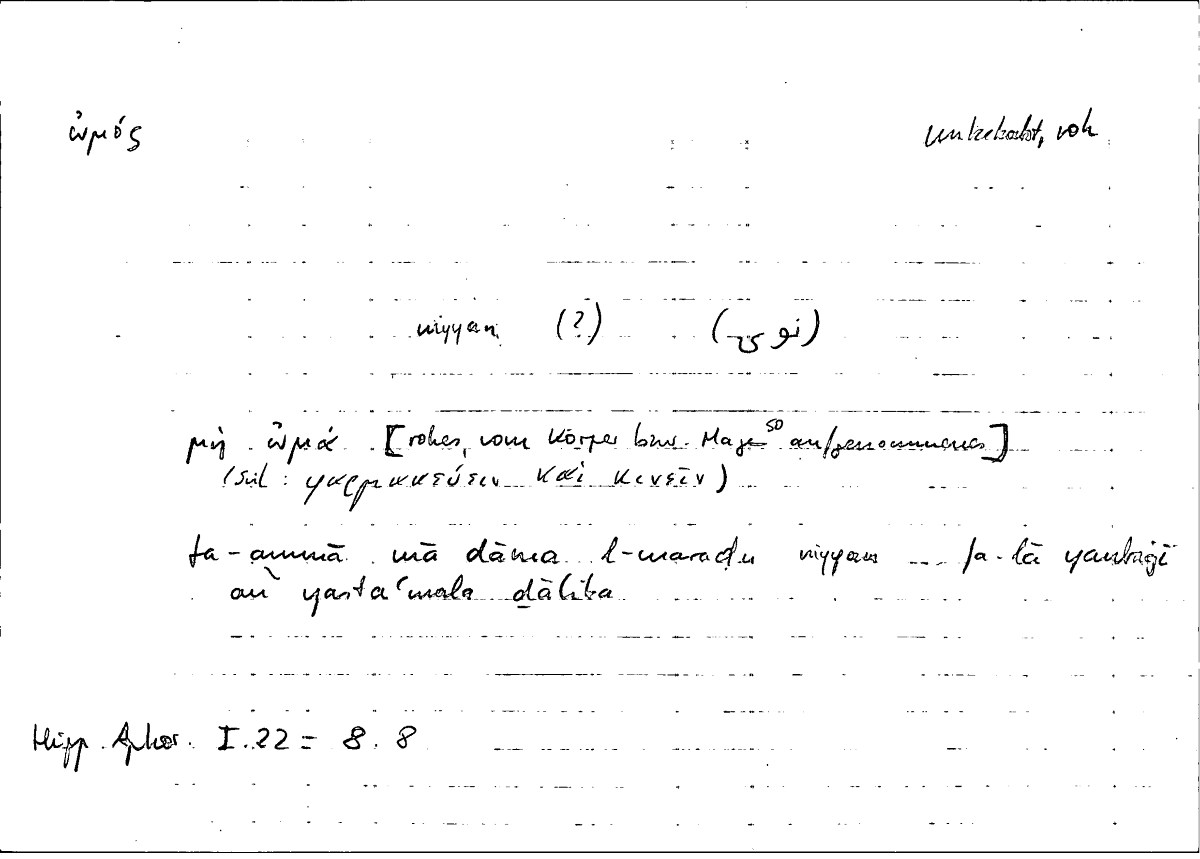 | Expression | τὰ ὠμά | mā dāma l-maraḍu niyyan |