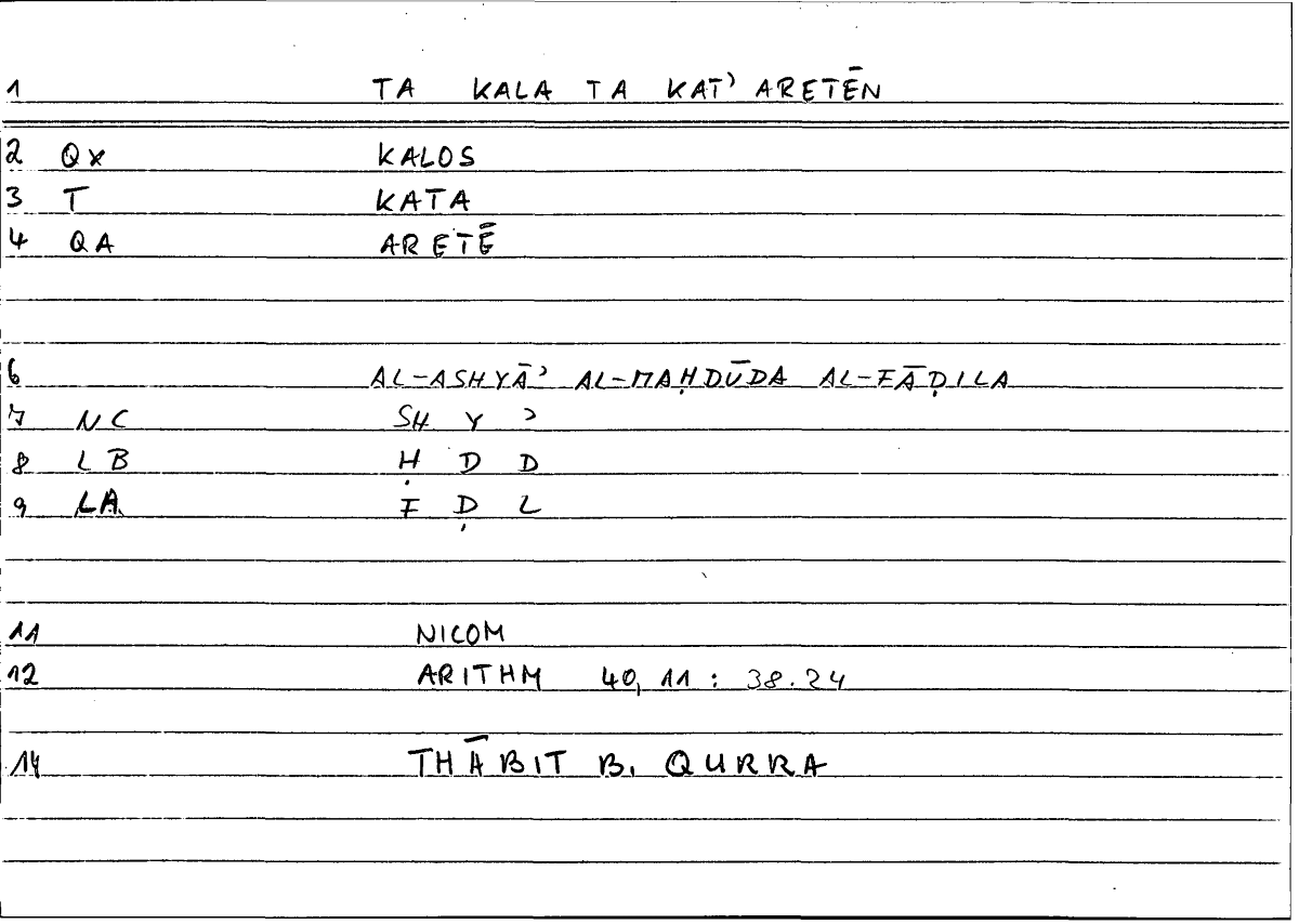 Expressionτὰ καλὰ τὰ κατ' ἀρετὴνal-ašyāʾu l-maḥdūdatu l-fāḍilatu