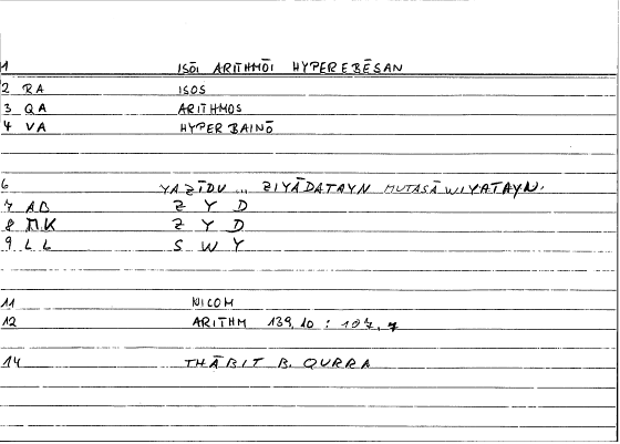 Every record of the glossary holds information on one translated word from Greek into Arabic. The records provide grammatical data and editor's comments as well. The transcription of the references is still in progress. If no reference is given here, you can check open the glossary by clicking on the lemma and consult the original filecard scan.