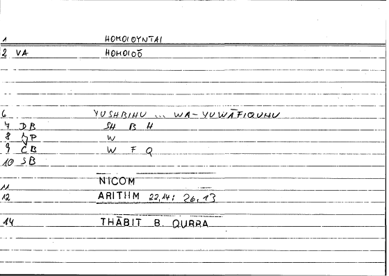 Every record of the glossary holds information on one translated word from Greek into Arabic. The records provide grammatical data and editor's comments as well. The transcription of the references is still in progress. If no reference is given here, you can check open the glossary by clicking on the lemma and consult the original filecard scan.