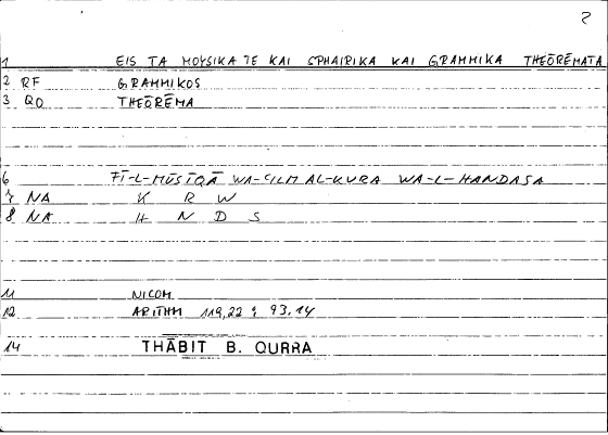 | Expression | εἰς τὰ μουσικά τε καὶ σφαιρικὰ καὶ γραμμικὰ θεωρήμαται | fī l-mūsīqā wa-ʿilmi l-kurati wa-l-handasati |