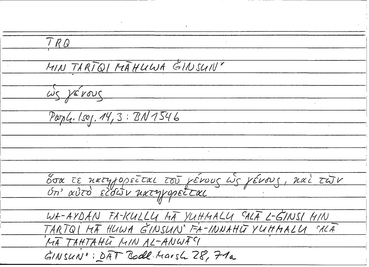 | Expression | ὅσα τε κατηγορεῖται τοῦ γένους ὡς γένους | mā yuḥmalu ʿalā l-ǧinsi min ṭarīqi mā huwa ǧinsun |