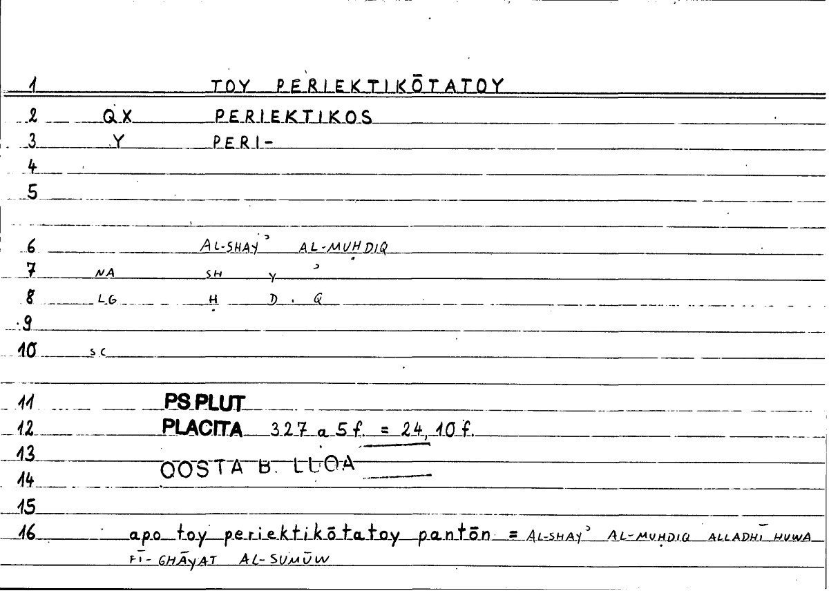 | Expression | τὸ περιεκτικώτατον πάντων | min al-šayʾi l-muḥdiqi llaḏī huwa fī ġāyati l-sumūwi |