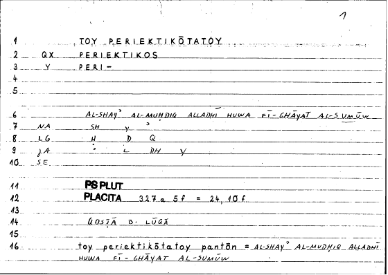 | Expression | τὸ περιεκτικώτατον πάντων | min al-šayʾi l-muḥdiqi llaḏī huwa fī ġāyati l-sumūwi |