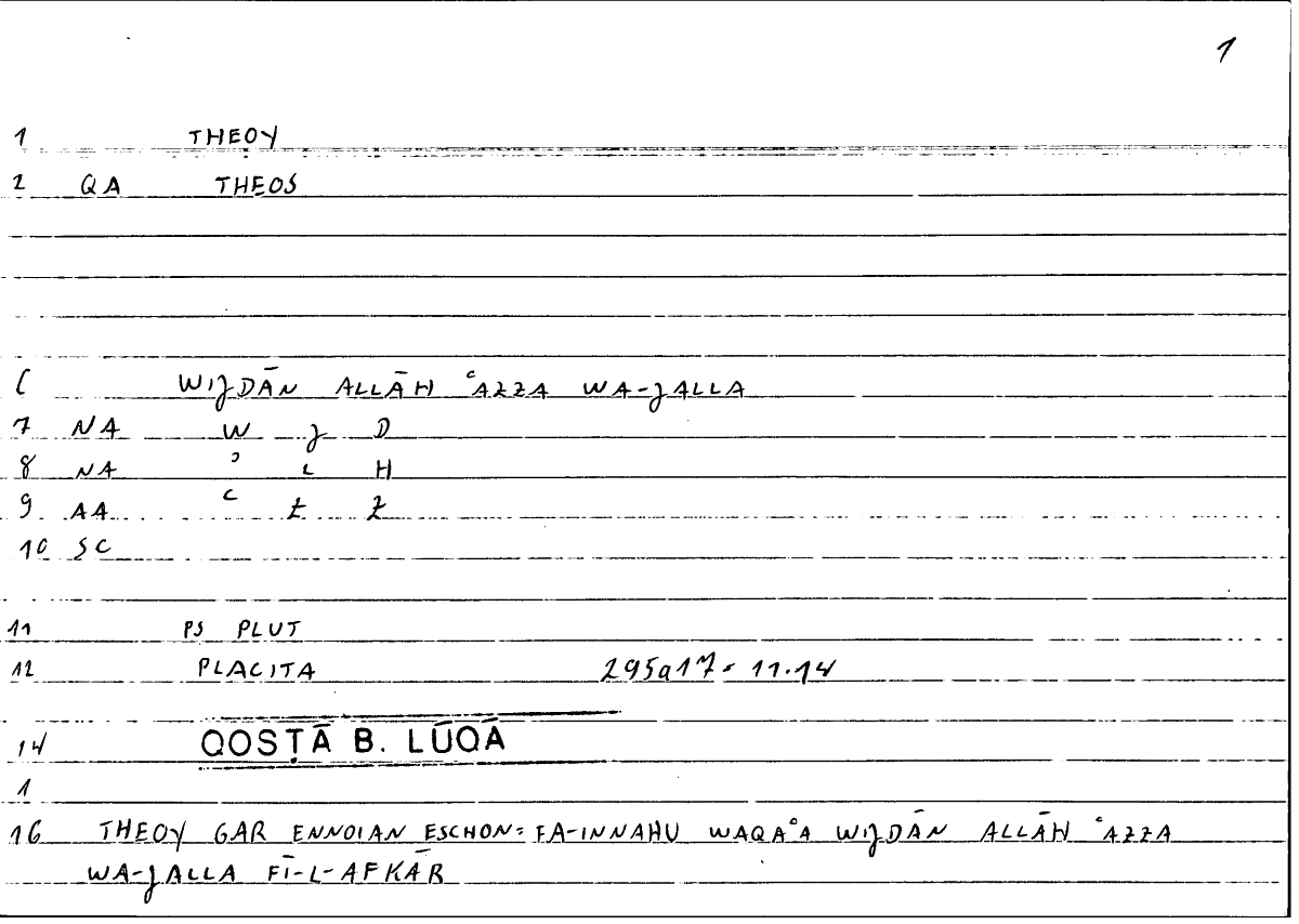 | Quotation | θεοῦ γὰρ ἔννοιαν ἔσχον | fa-innahu waqaʿa wiǧdānu llāhi ʿazza wa-ǧalla fī l-afkāri |