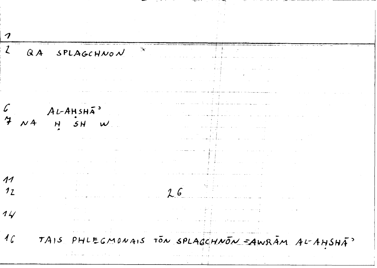 | Quotation | τούτων ἕκαστον μιγνύμενον οὖρά τε κινεῖ, ὅπερ τινός, ὡς μέγιστόν ἐστιν ἀγαθόν καὶ ταῖς φλεγμοναῖς τῶν σπλάγχνων συντελεῖ | kullu wāḥidin min hāḏihī tuḥallilu awrāma l-aḥšāʾi wa-tudirru l-bawla wa-hāḏā huwa ḫayru mā yuḥtāǧu ilayhī fī hāḏihī l-maraḍi |