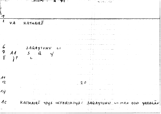 | Quotation | ἐγὼ μὲν οὖν, φησίν, μίσγω εὐφορβίου, ἐπιθύμου, ἀλόης πετροσελίνου καὶ δαύκου σπέρματος, καθαίρω τοὺς ἰκτερικούς | wa-ammā anā fa-innī aḫliṭu maʿa l-furbiyūn afīṯimūn wa-ṣabir wa-faṭrāsāliyūn wa-bizra l-dawqū wa-filfilan wa-saqaytuhū li-man bihī yaraqānun |