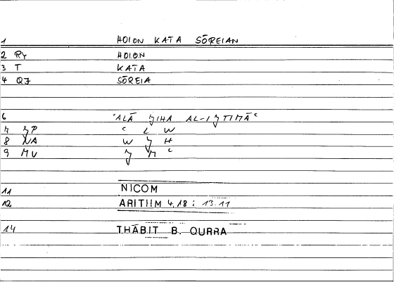 Every record of the glossary holds information on one translated word from Greek into Arabic. The records provide grammatical data and editor's comments as well. The transcription of the references is still in progress. If no reference is given here, you can check open the glossary by clicking on the lemma and consult the original filecard scan.