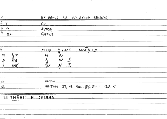 Every record of the glossary holds information on one translated word from Greek into Arabic. The records provide grammatical data and editor's comments as well. The transcription of the references is still in progress. If no reference is given here, you can check open the glossary by clicking on the lemma and consult the original filecard scan.