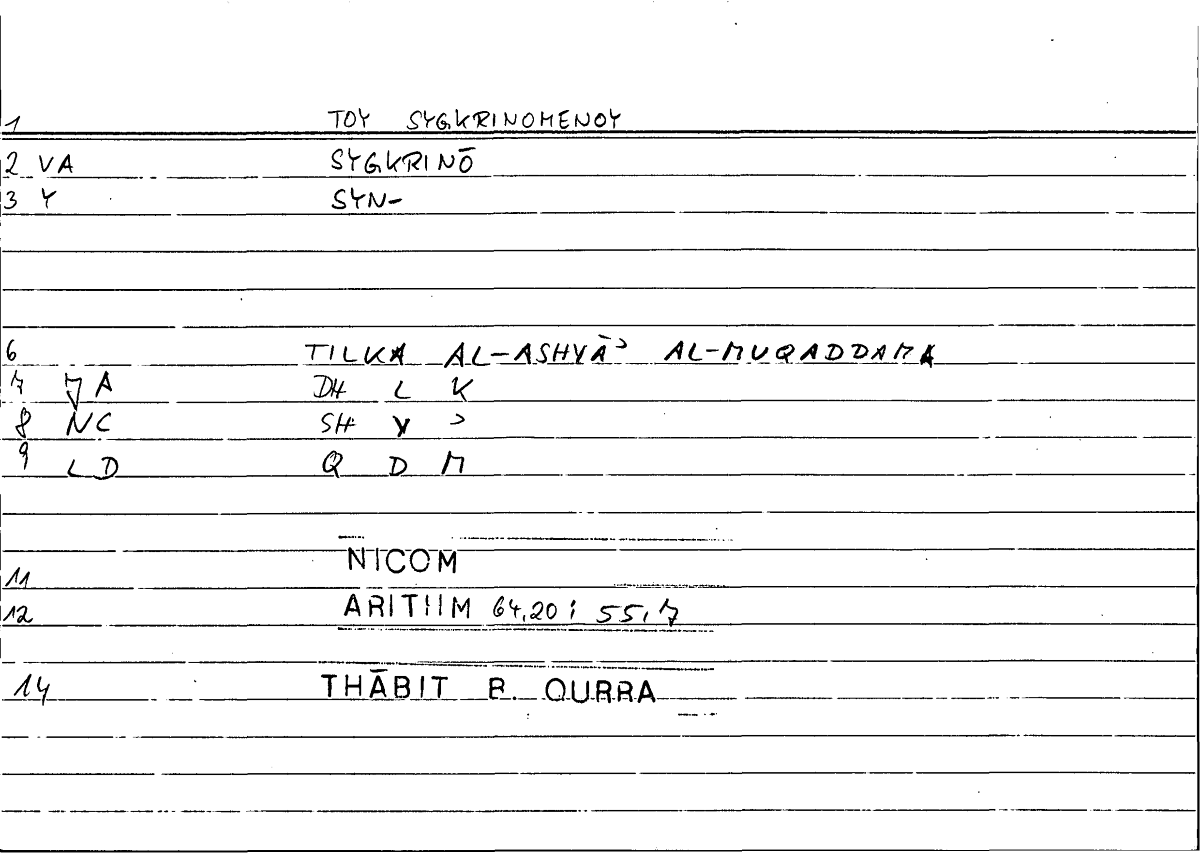 | Expression | τοῦ συγκρινομένου | tilka l-ašyāʾu l-muqaddamatu |
