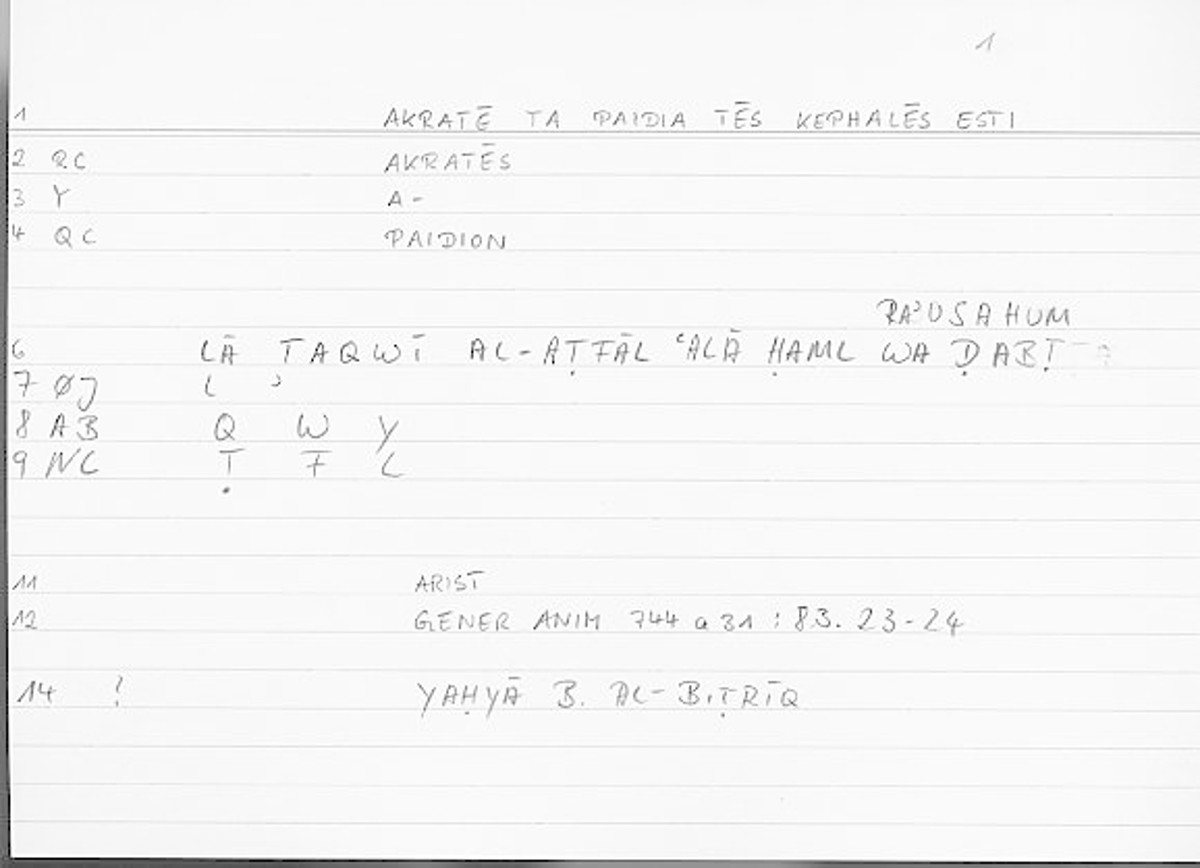 | Expression | ἀκρατῆ τὰ παιδία μέχρι πόρρω τῆς κεφαλῆς ἐστι | lā taqwī l-aṭfālu ʿalā ḥamlin wa ḍabṭun raʾusahum zamānan kaṯīran |