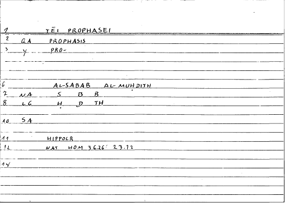 Every record of the glossary holds information on one translated word from Greek into Arabic. The records provide grammatical data and editor's comments as well. The transcription of the references is still in progress. If no reference is given here, you can check open the glossary by clicking on the lemma and consult the original filecard scan.