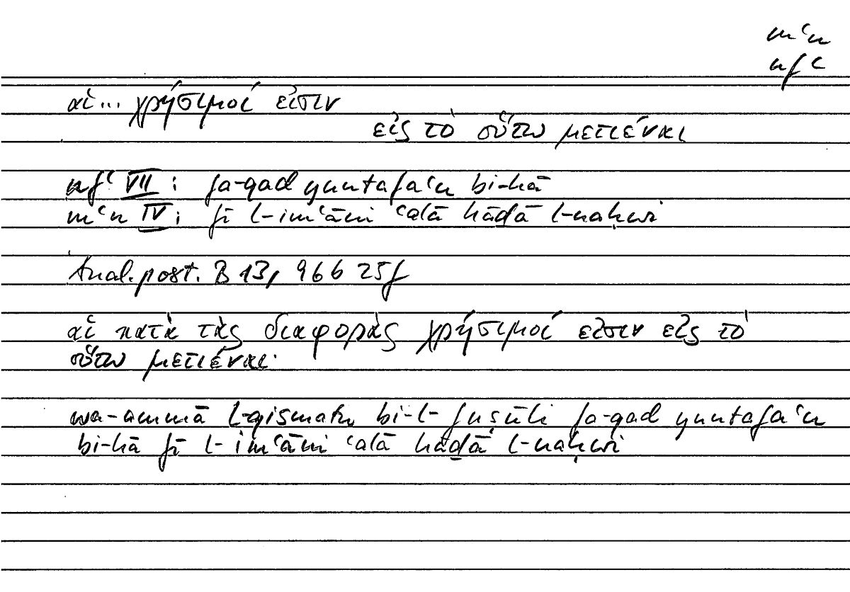 | Expression | αἱ...χρήσιμοί εἰσιν εἰς τὸ οὕτω μετιέναι | fa-qad yuntafaʿu bi-hā fī l-imʿāni ʿalā hāḏā l-naḥwi |