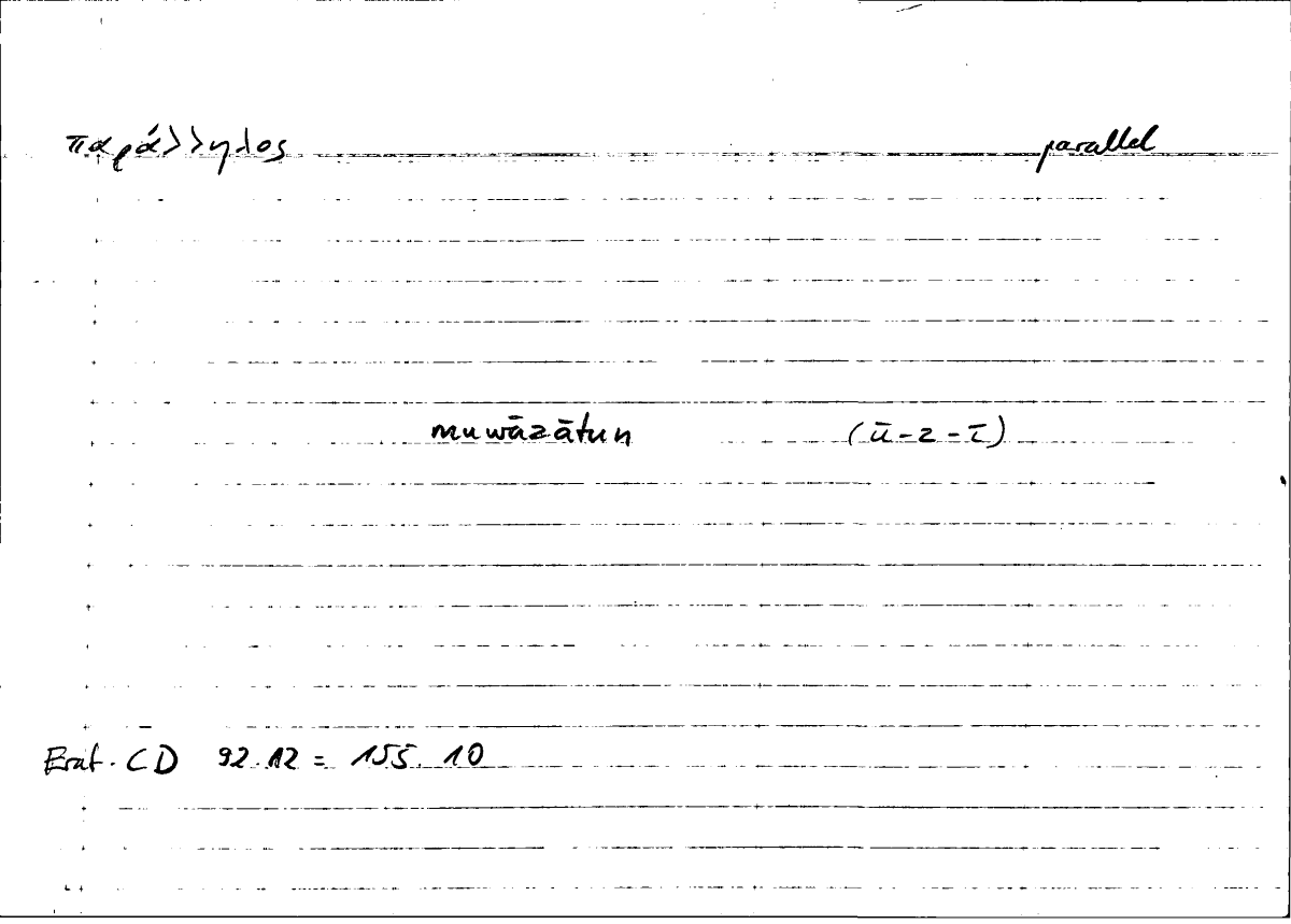 | Quotation | ἔσται δή, ὡς ἡ ΑΚ πρὸς ΚΒ ἐν δὲ ταῖς ΑΖ, ΒΗ παραλλήλοις ἡ ΖΚ πρὸς ΚΗ | fa-yakūnu iḏan ṭūlu AK ilā KB min qibali muwāzāti AZ li-ḫaṭṭi BḤ yakūnu ka-nisbati ZK ilā KḤ |