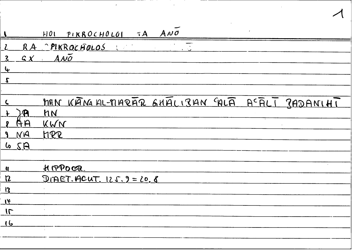 | Expression | οἱ πικρόχολοι τὰ ἄνω | man kāna l-marāru ġāliban ʿalā aʿālī badanihī |