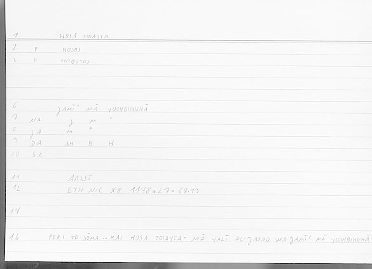 | Quotation | μᾶλλον διαπονεῖ περὶ τὸ σῶμα ὁ πολιτικός καὶ ὅσα τοιαῦτα | al-madaniyyu akṯaru taʿaban fī-mā yalī l-ǧasada wa-ǧamīʿa mā yušbihuhā |