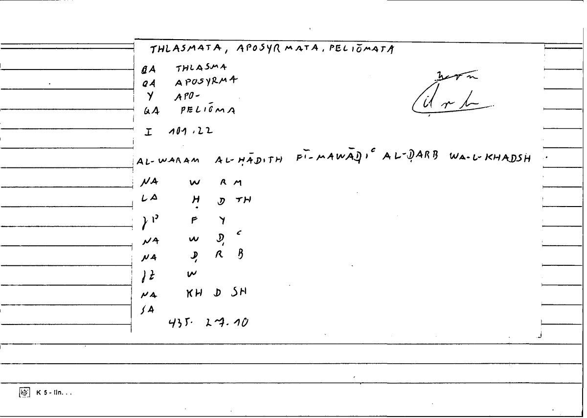 | Expression | θλάσματα, ἀποσύρματα, πελιώματα | al-waramu...yaʿriḍu fi mawāḍiʿi l-ḍarbi wa-āṯārihī wa-l-ḫudūšu llatī yaʿriḍu fī l-badani |
